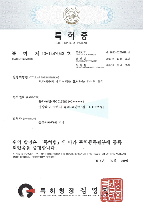 Patent[R&D] Patent (No. 10-1447943, Lighting device that displays the standby sta…