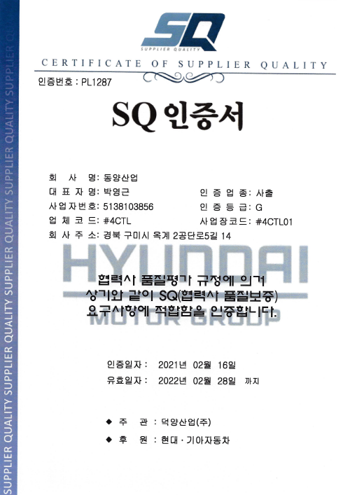 동양산업 SQ인증서