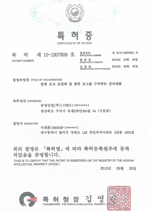 专利证[R&D] 专利证第10-1307809号(发光LOGO组装体及配有发光LOGO的电子产品)