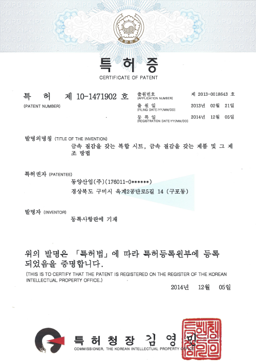 특허증(제10-1471902호,금속질감을 갖는 복합시트,금속질감을 갖는 제품 및 그 제조 방법)