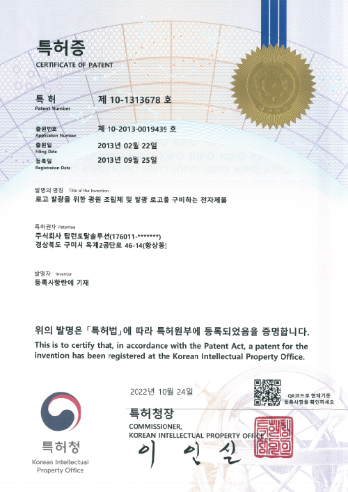특허증(제10-1307809호, 발광 로고 조립체 및 발광 로고를 구비하는 전자제품)