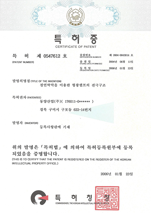 专利证第 0547612号(利用了绝缘薄膜的荧光灯的电极结构)