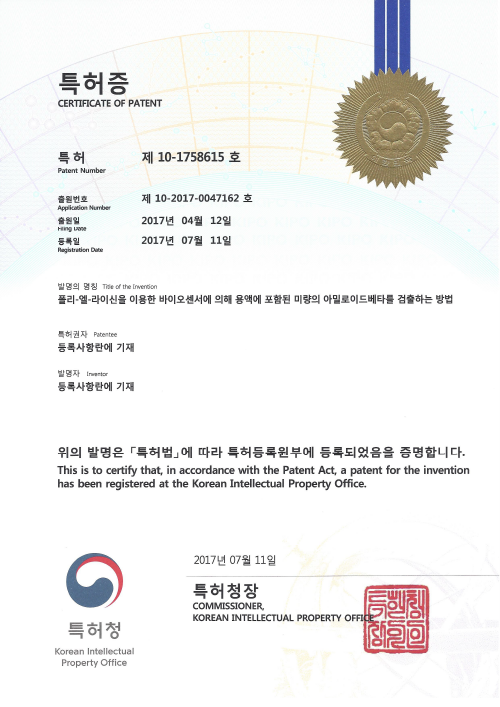 专利证[R&D] 专利证第10-1758615号(通过使用了聚赖氨酸的生物传感器检测出溶液中包含的微量β-淀粉样蛋白的方法)